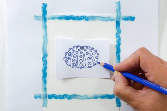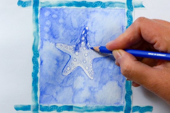 1. Töltsük le innen a tengericsillag mintát, és nyomtassuk ki. Árnyékoljuk a sablon hátulját a sötétkék akvarell ceruzával. Helyezzük a sablont (az előlappal felfelé) pontosan az akvarellpapír közepére. Az akvarellceruzával rajzoljuk le a körvonalakat és a vonalakat. Ezzel a motívumot átvisszük a papírra. Mielőtt eltávolítaná a sablont, ellenőrizze, hogy minden vonal átkerült-e.