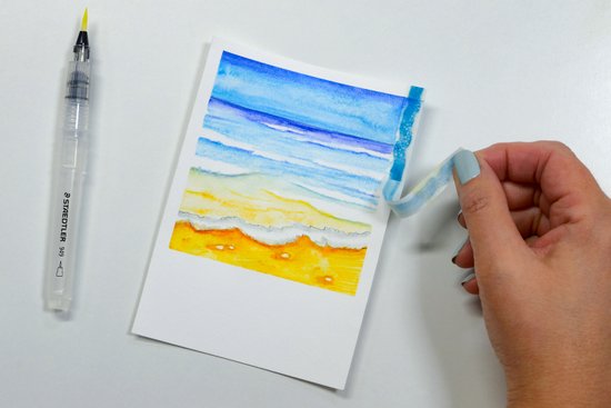 8. Ezután hagyjunk mindent alaposan megszáradni, és óvatosan távolítsuk el a festőszalagot a papírról.
