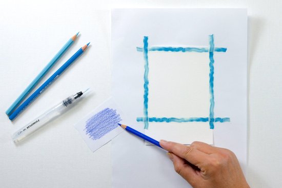 2. Helyezzük a sablont (az előlappal felfelé) pontosan az akvarellpapír közepére. Az akvarellceruzával rajzoljuk le a körvonalakat és a vonalakat. Ezzel a motívumot átvisszük a papírra. Mielőtt eltávolítaná a sablont, ellenőrizze, hogy minden vonal átkerült-e.