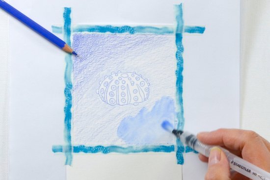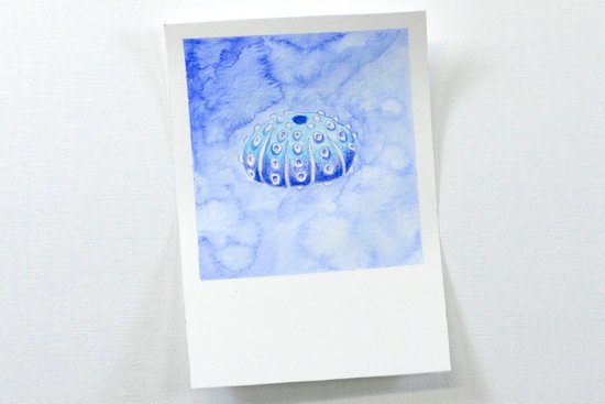 3. Árnyékoljuk sötétkékkel a tengeri sün körüli területet. Fessük meg a hátteret az akvarell ecsettel. Ha élénk hátteret szeretnénk, cseppentsünk vízcseppeket a kissé nedves színbe.