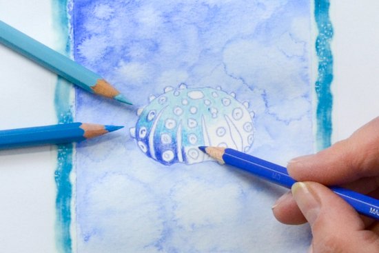 4. Most árnyékoljuk a tengeri sünt egy színátmenettel. Hagyjuk szabadon a köröket. Kezdjük a tetején világos türkizkékkel, majd középen használjunk középkéket, alatta pedig sötétkéket, és erősen nyomjuk rá a papírlapra a ceruzát.