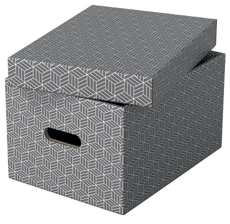 Stílusos és modern karton tárolódobozok levehető tetővel azonnali otthoni tároláshoz. Három azonos méretű doboz, amelyeket önállóan vagy polcokra helyezve használhat személyes dokumentumok, könyvek, játékok rendezett tárolásához.