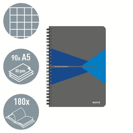 Spirálfüzet, A5, kockás, 90 lap, PP borító, LEITZ "Office", szürke-kék