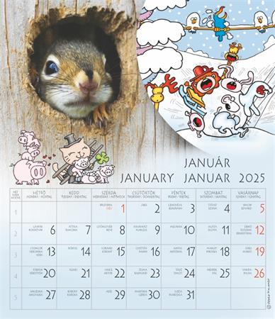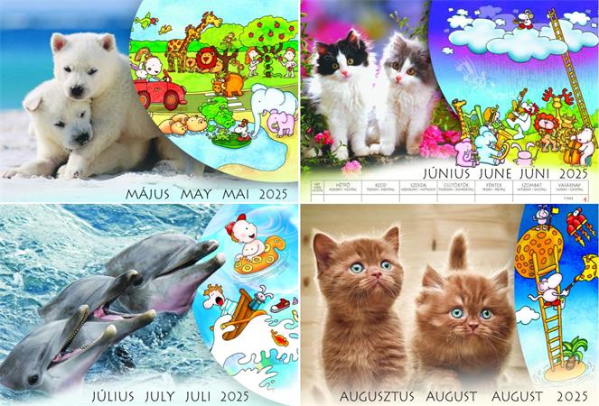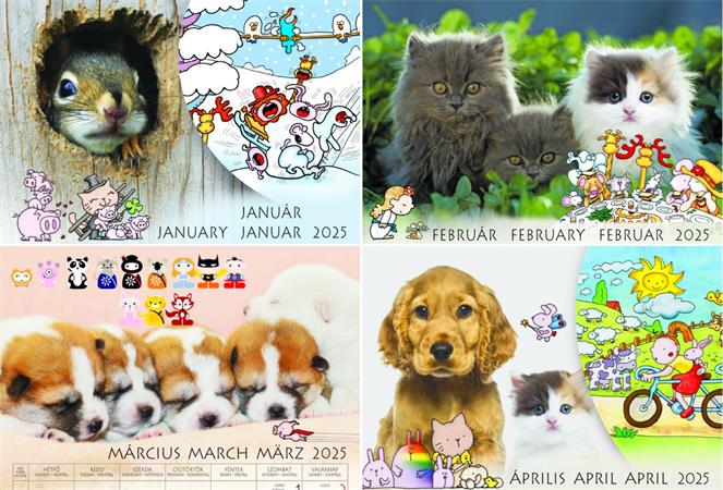 -naptár rész: magyar, angol, német nyelven, magyar ünnepekkel és névnapokkal